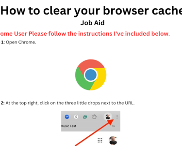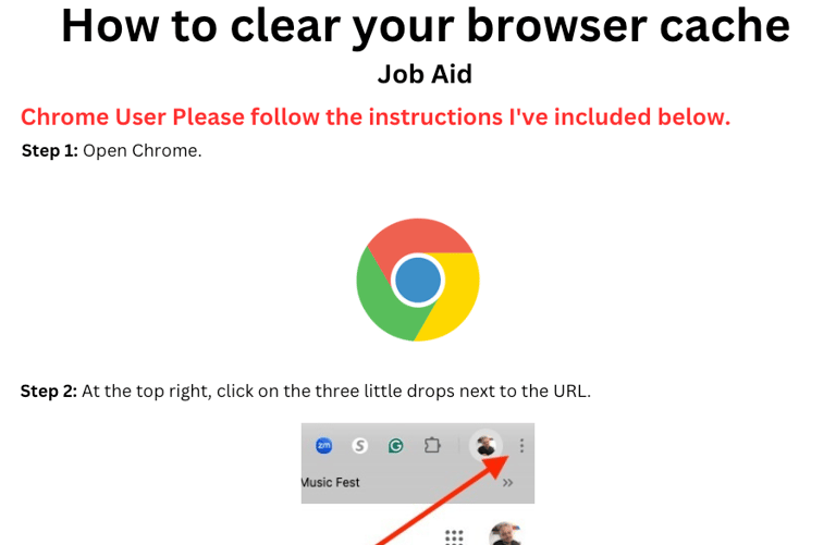 This technical job aid was created to help faculty, staff, and learners troubleshoot browser-related issues by guiding them through clearing their cache in Chrome and Firefox. Designed as a clear, step-by-step resource with visual cues and user-friendly language, the goal was to reduce help desk tickets and empower users with just-in-time support.
